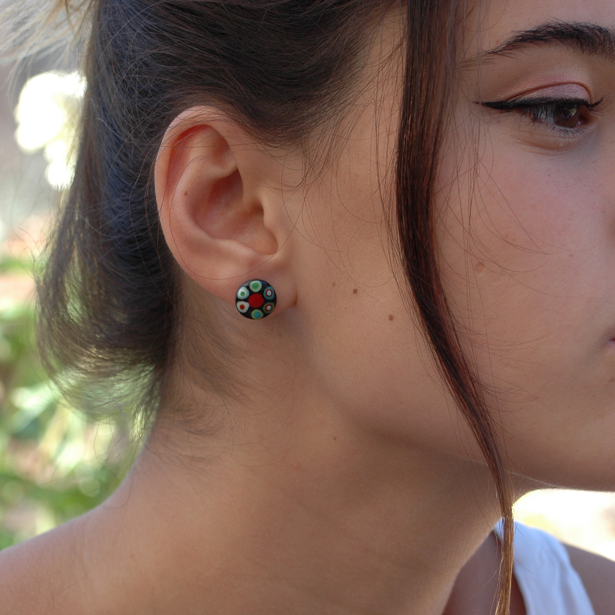 Originales pendientes pequeños con cierre de presión en plata de 1ª Ley. Son muy elegantes, en el fondo negro resaltan con alegría los colores verde y rojo. Cuando los lleves puestos se iluminará tu cara y te llenarán de energía. Son joyas únicas y llenas de amor. No te cansarás de llevarlos todos los días. Los metales (palito y tuerca) son de plata hipoalergénica, así evitarás que te hagan daño y los podrás disfrutar con tranquilidad.