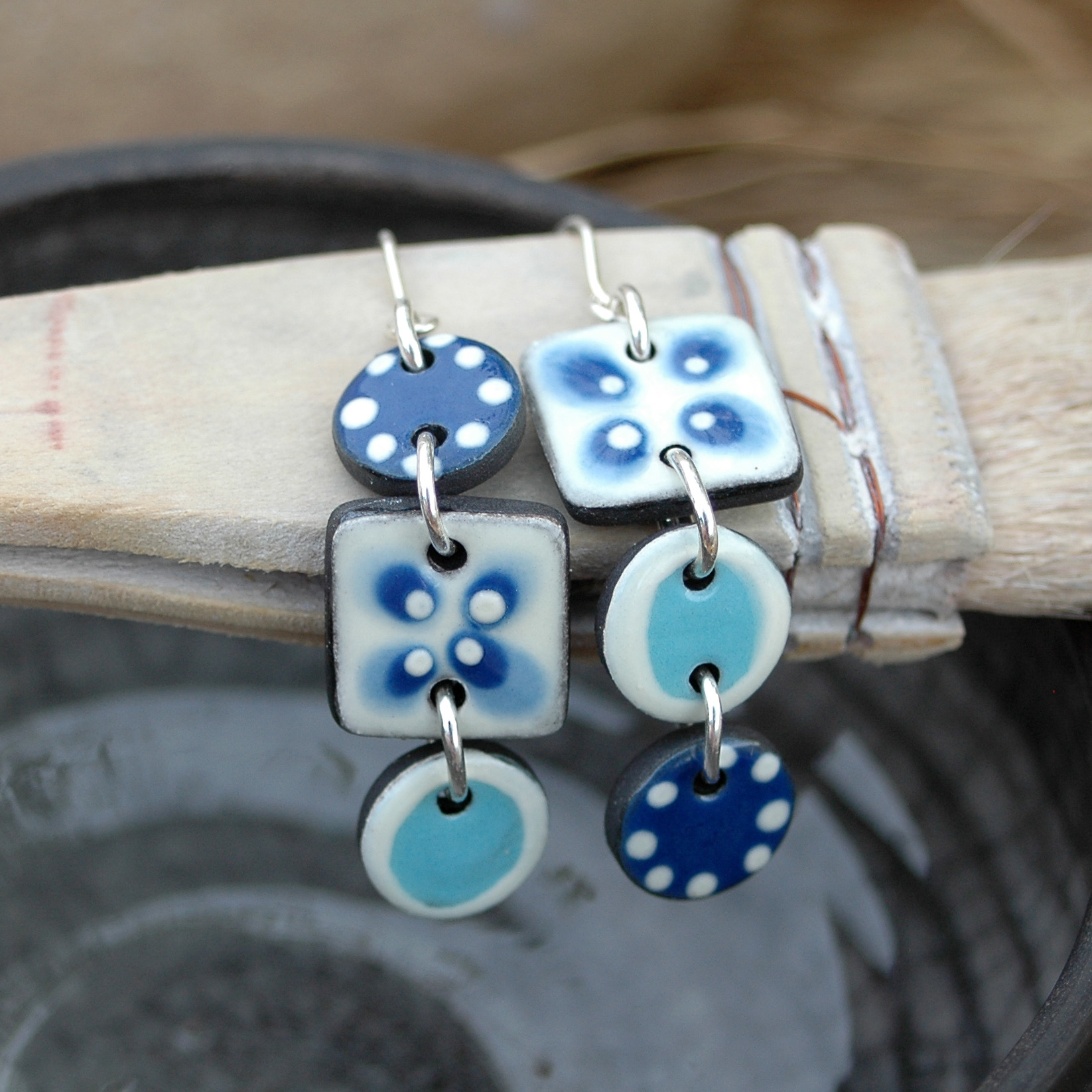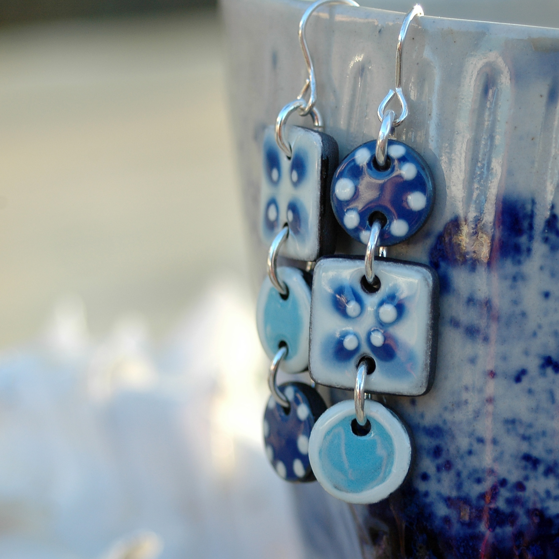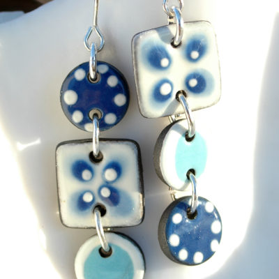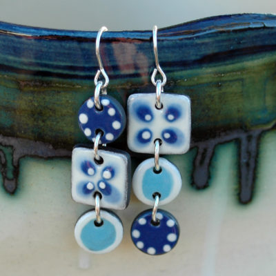 Pendientes largos en azul y blanco de cerámica.