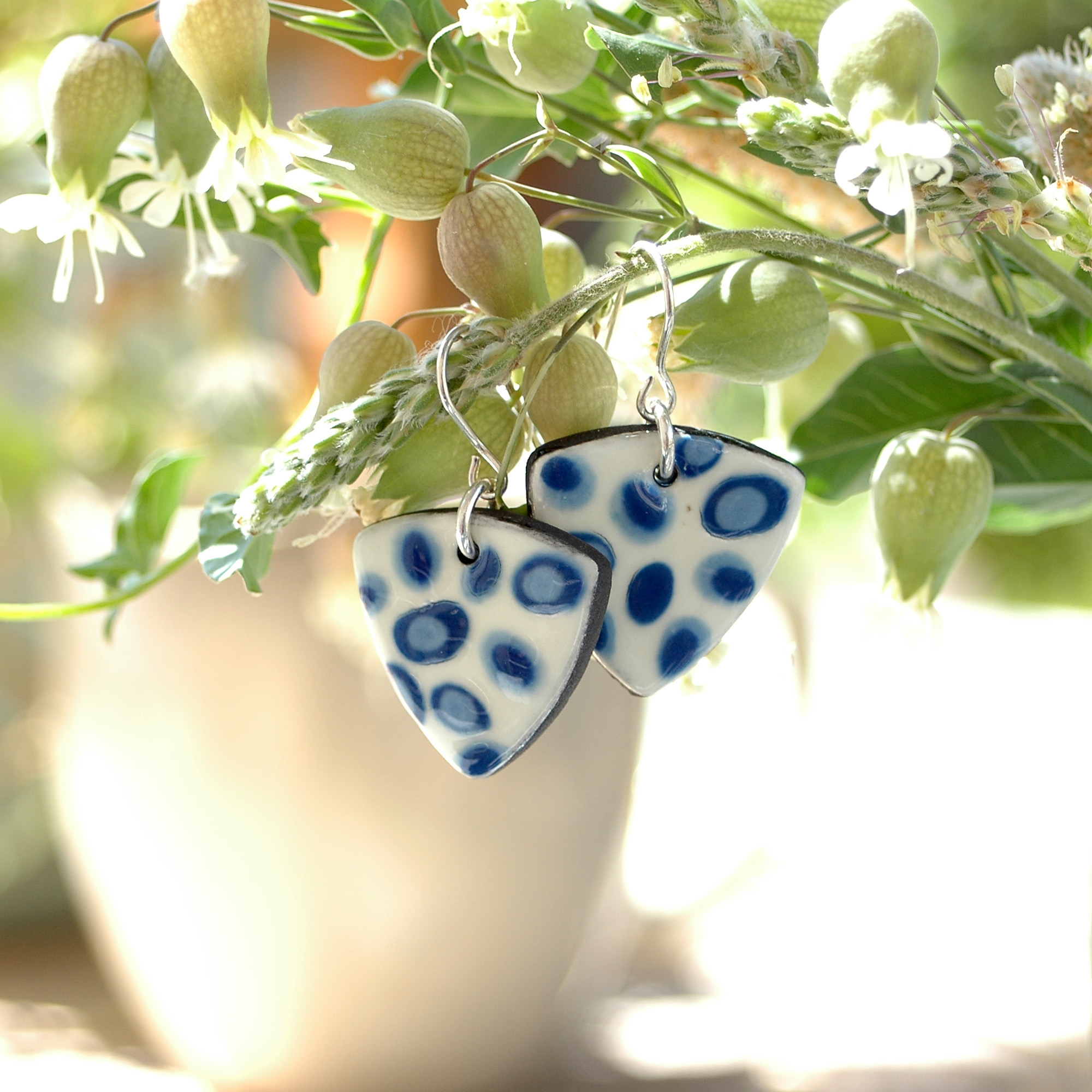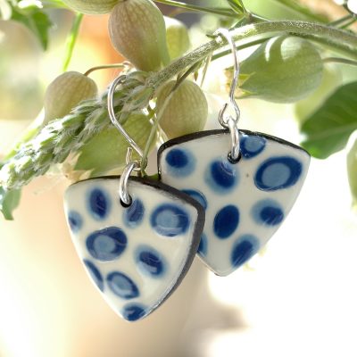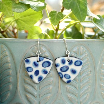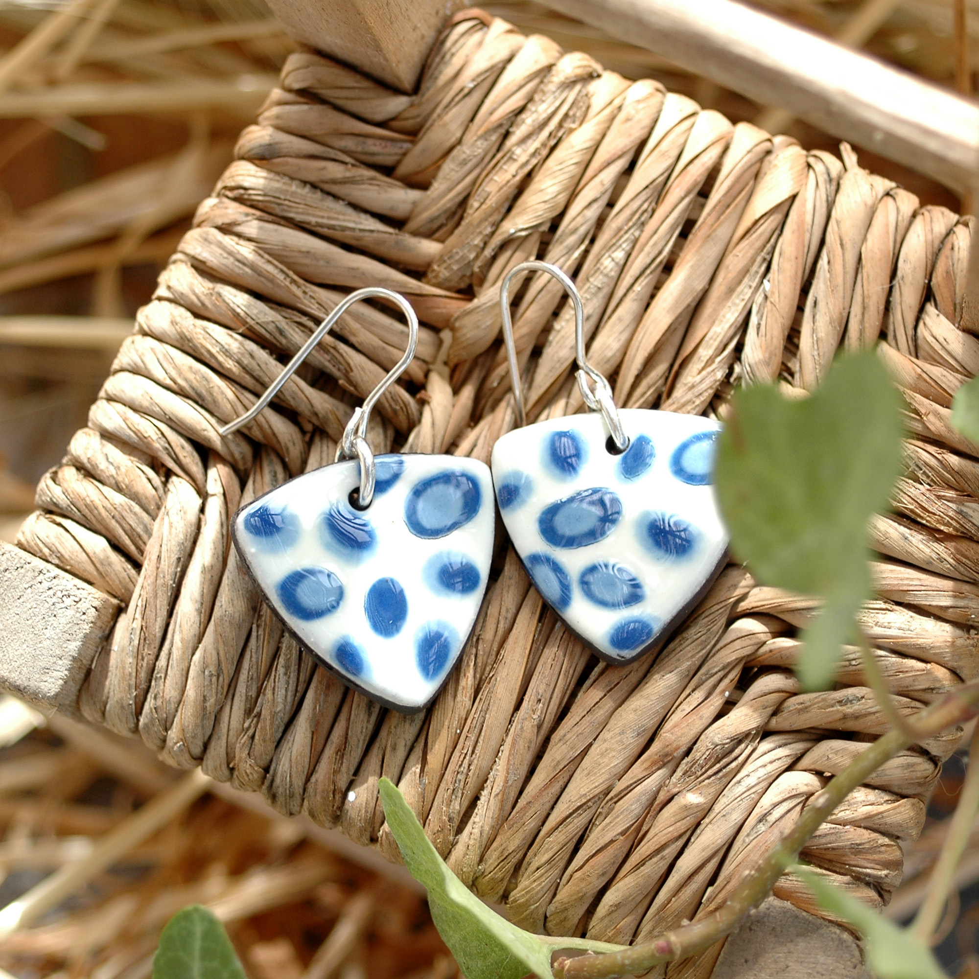 Pendientes de una pieza triangulares con fondo blanco y manchas azuladas.