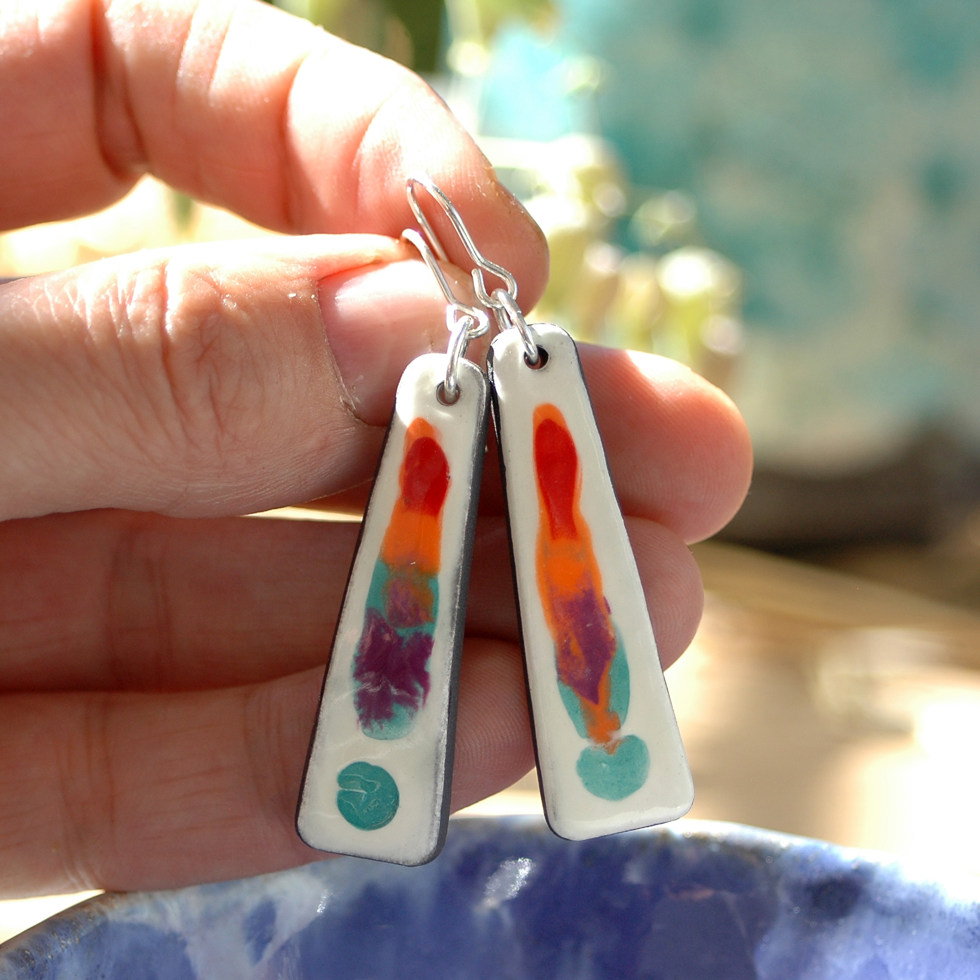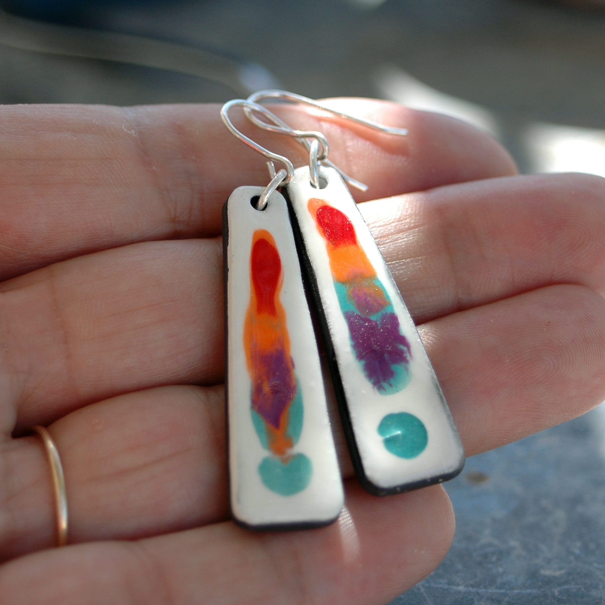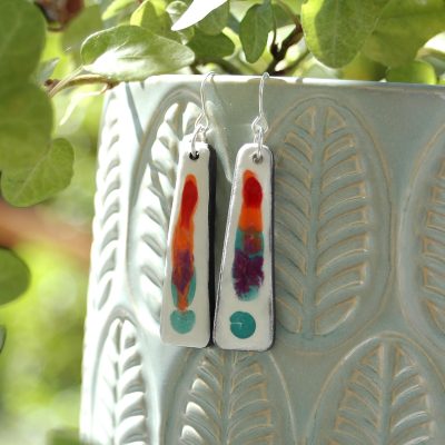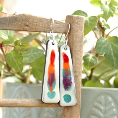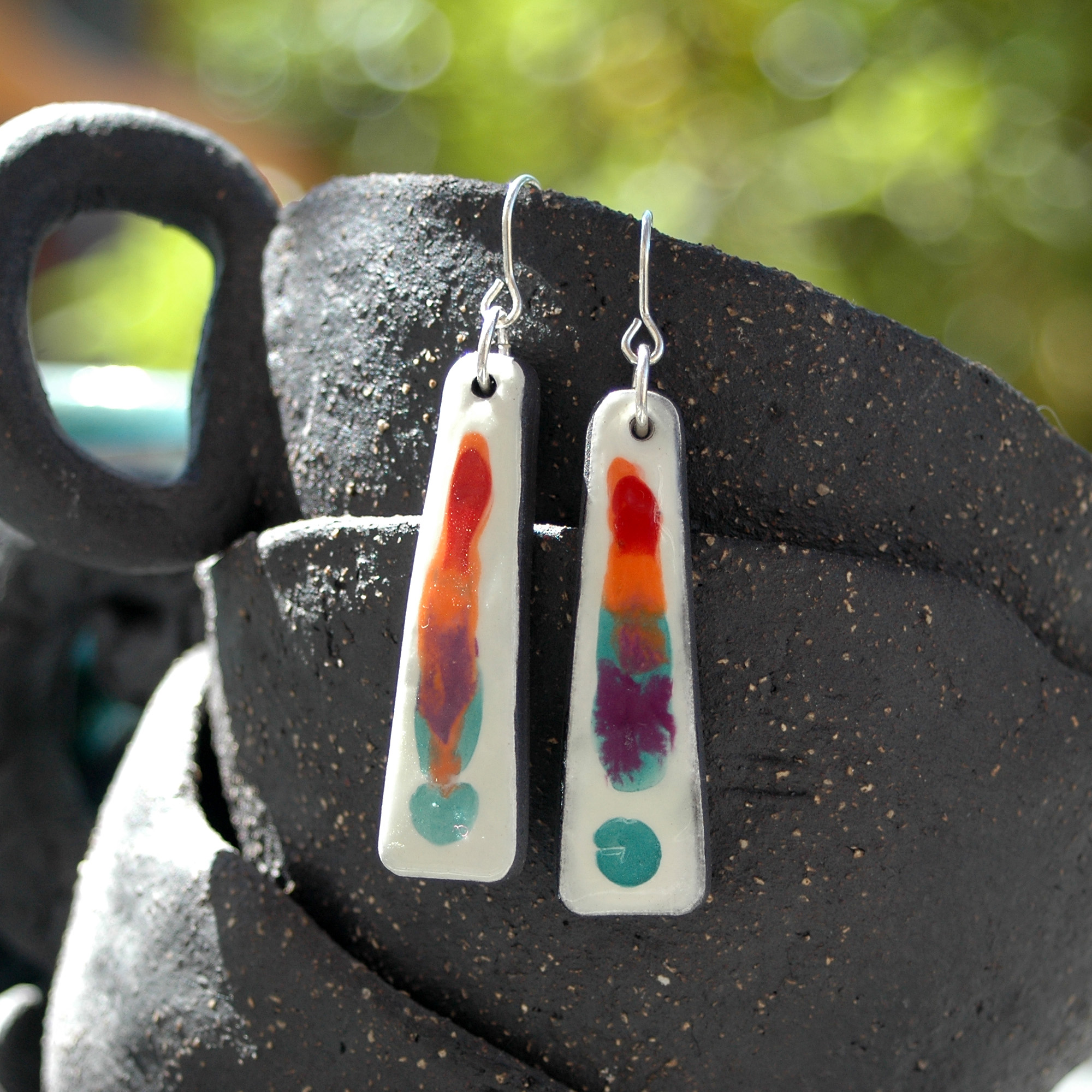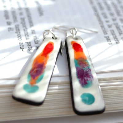 Pendientes alargados de una pieza con fondo blanco y manchas multicolor.