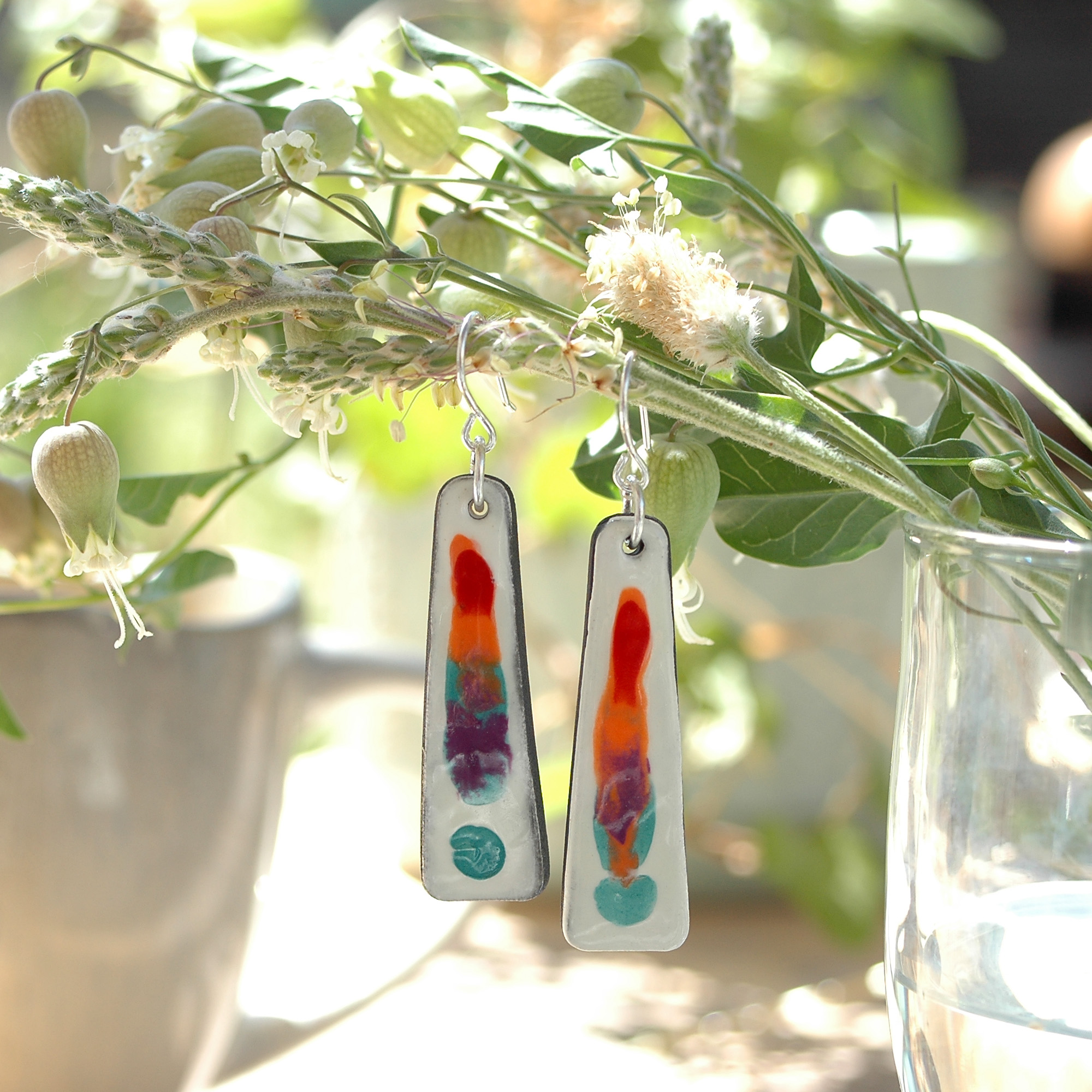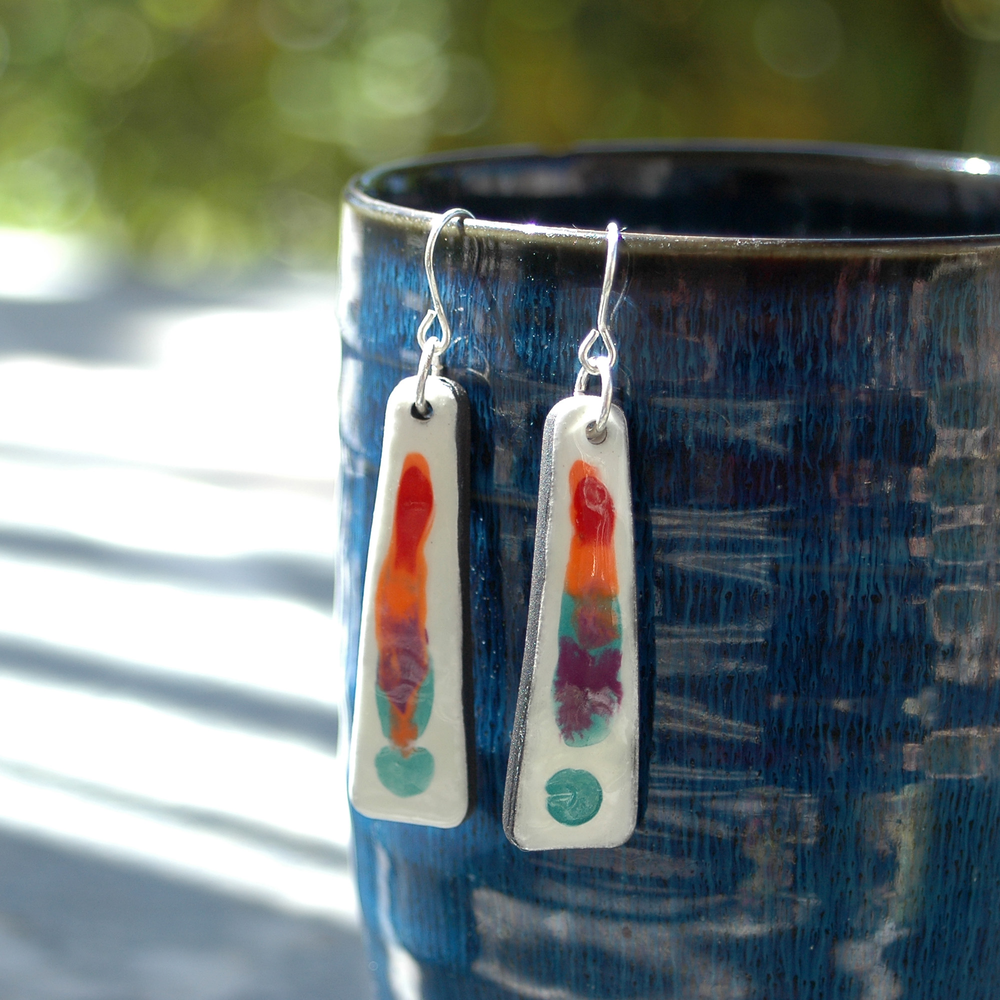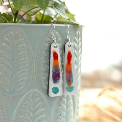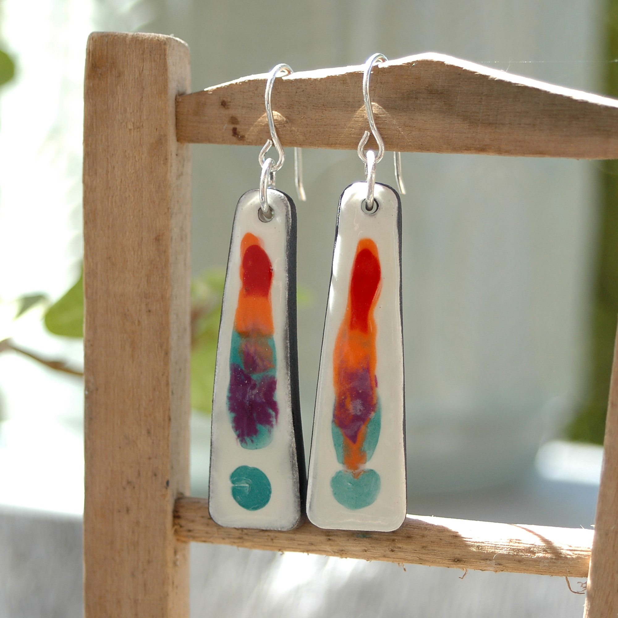 Pendientes alargados de una pieza con fondo blanco y manchas multicolor.