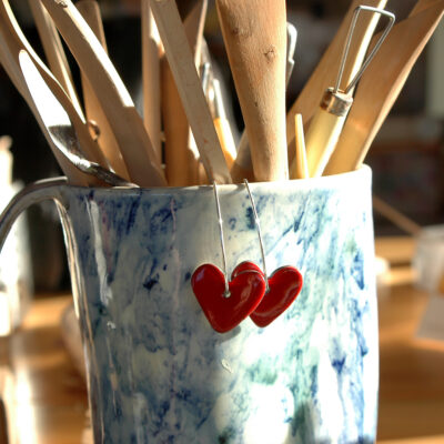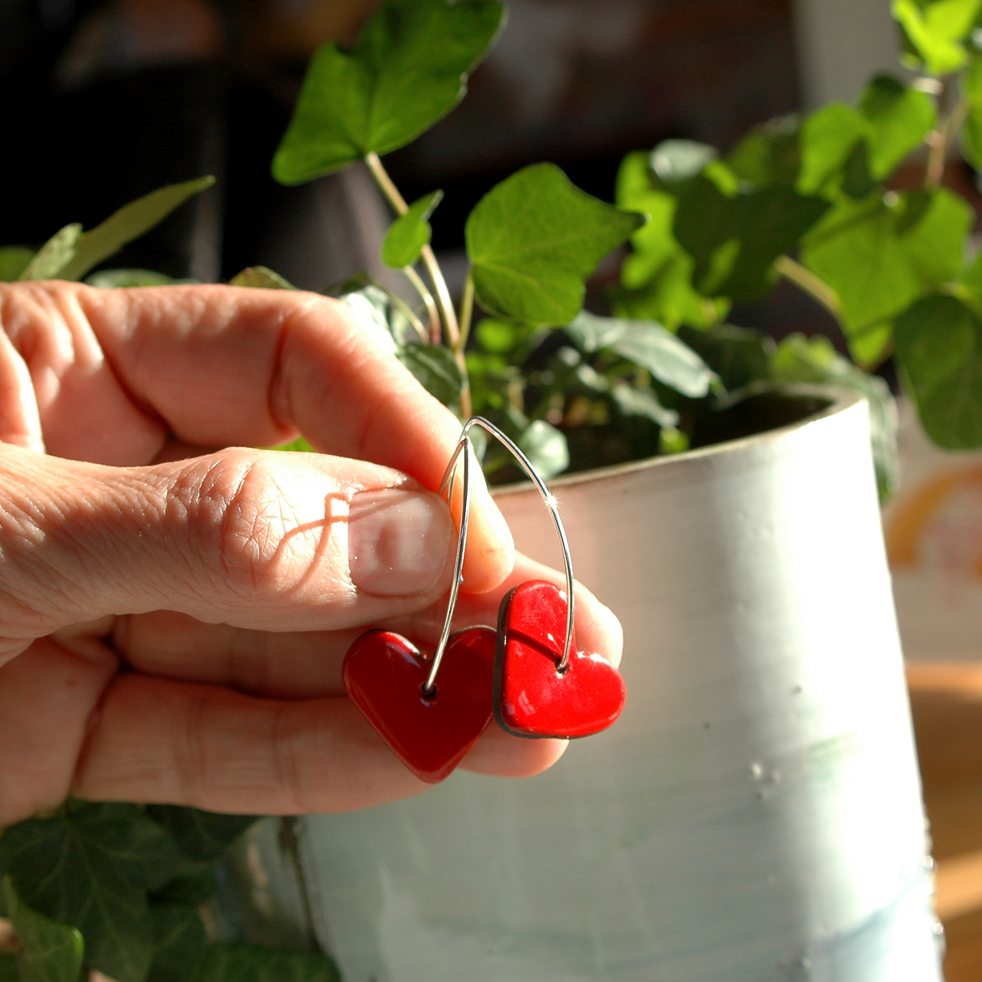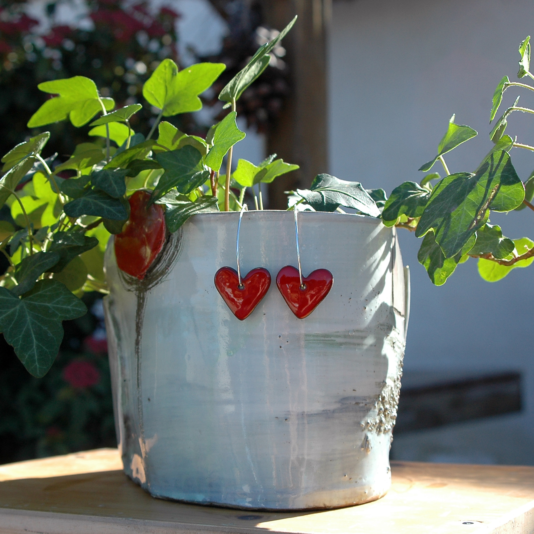 Pendientes Corazón Rojo de cerámica con gancho de plata largo.