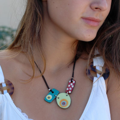 Este collar es ajustable, podrás llevarlo como collar o como gargantilla. Es original, liviano y muy creativo. Combinan las formas geométricas con los estilos psicodélico y mediterráneo. Las tres piezas están unidas mediante anillas de plata de 1,5 mm de espesor. El sistema de cierre está compuesto por una bola de plata que se desliza por el cordón de nylon hasta dejarlo a la altura que desees. Es una joya preciosa para lucirla en tu escote y llamará la atención de quien la mire. El estilo es atemporal y no te cansarás de lucirla. ¿Te atreves?