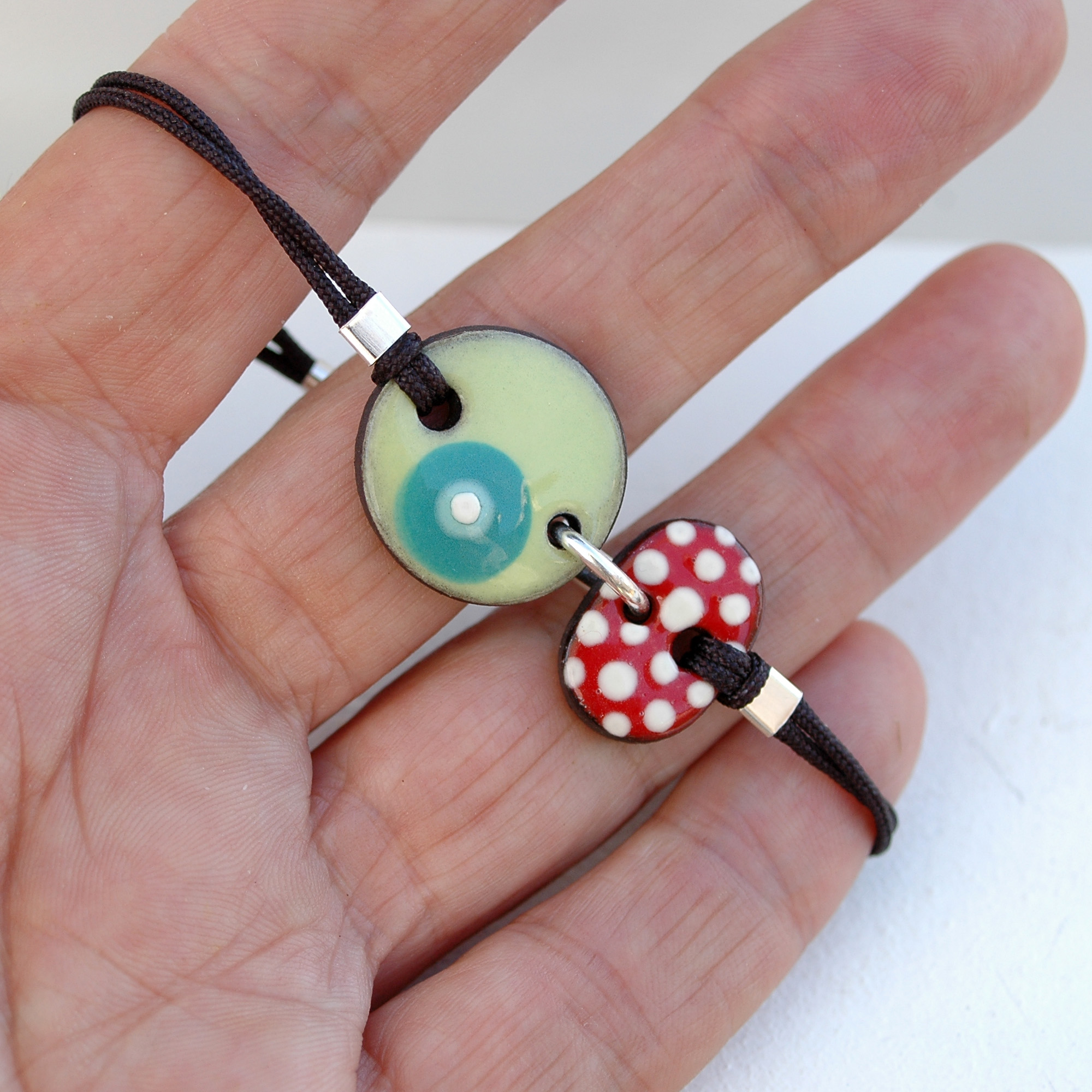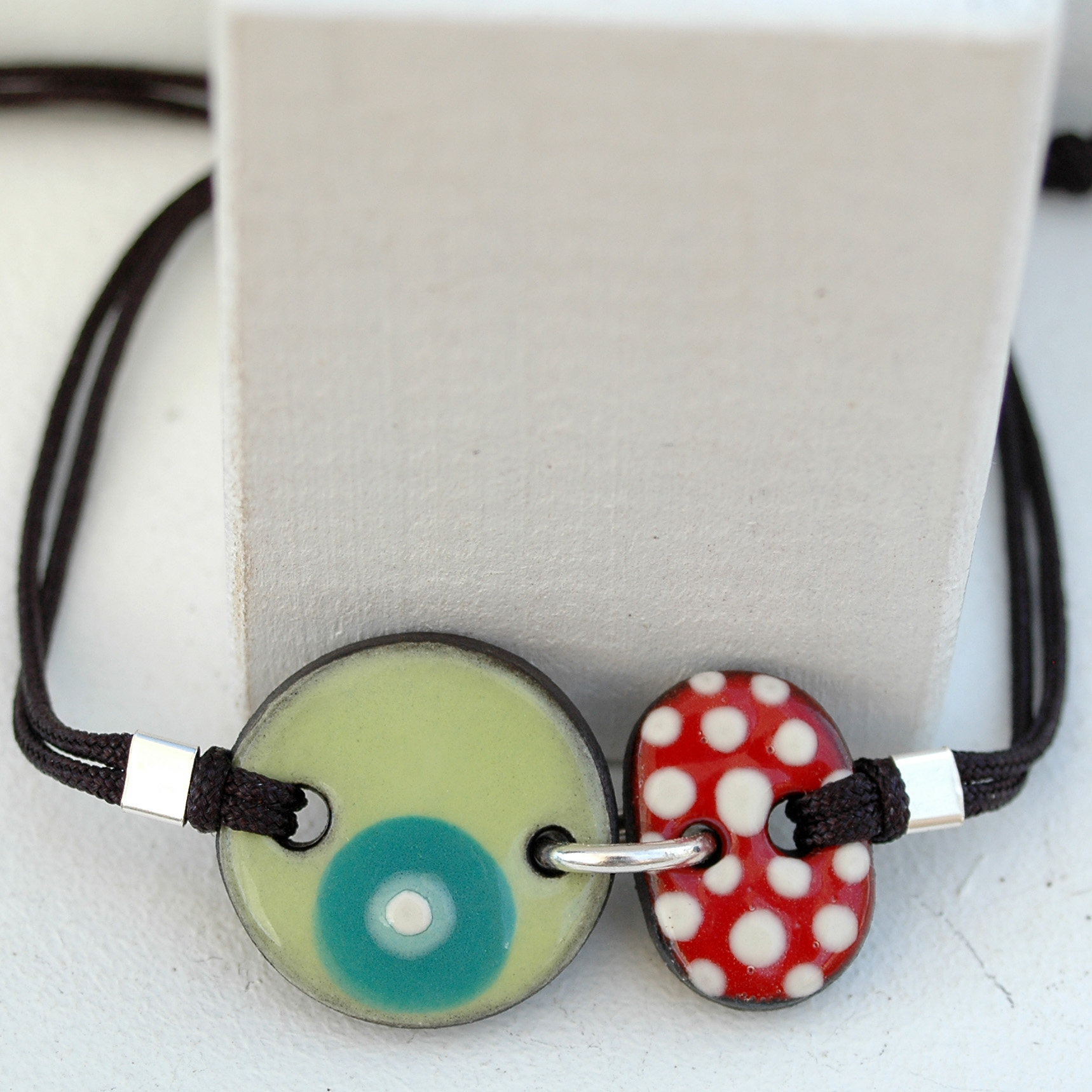 Una pieza redonda lima claro en combinación con otra roja de lunares blancos, llamativa y hermosa.