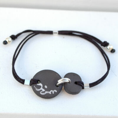 Compuesta por refrescantes piezas redondas unidas por una anilla de plata. El cordón es de nailon y tiene pequeñas bolitas de plata en los extremos.